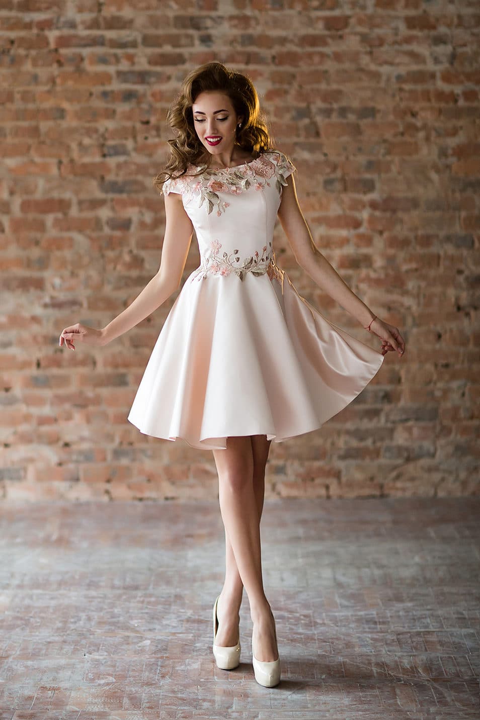 An excellent choice for graduation, this creamy, short dress with floral décor. The hair here is loose and has a good volume. The curls can be wound on large curlers or made a pile and fix the hairdo with varnish. Bright arrows and fuchsia lipstick are well suited to the cream color of the dress.