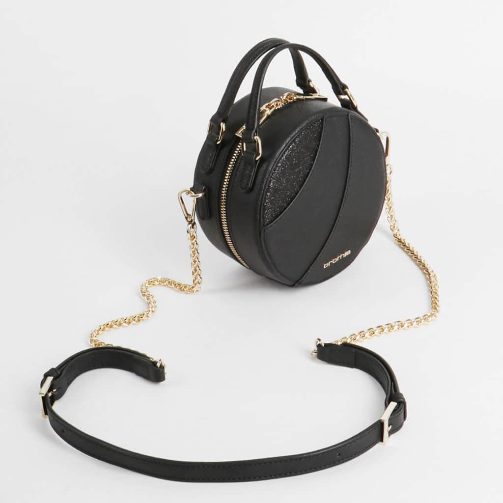 Shoes are pumps in black, as well as a round bag.
