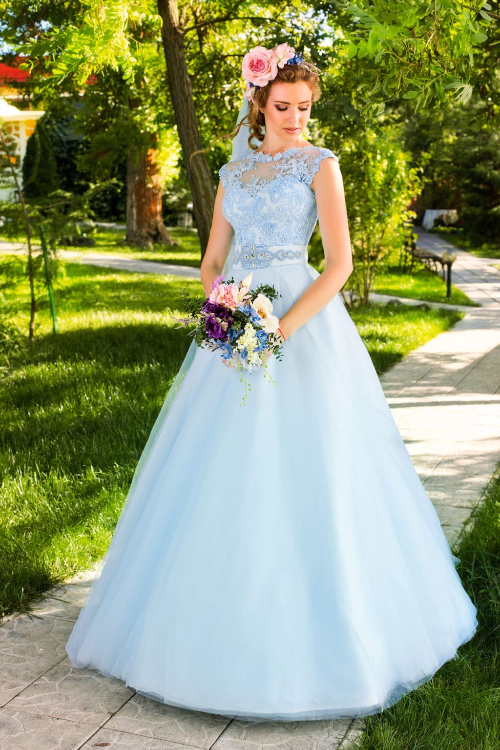 Dress in delicate azure color suits white-skinned girls well. Under it, you can use bright decors, and in the hair weave flower buds.