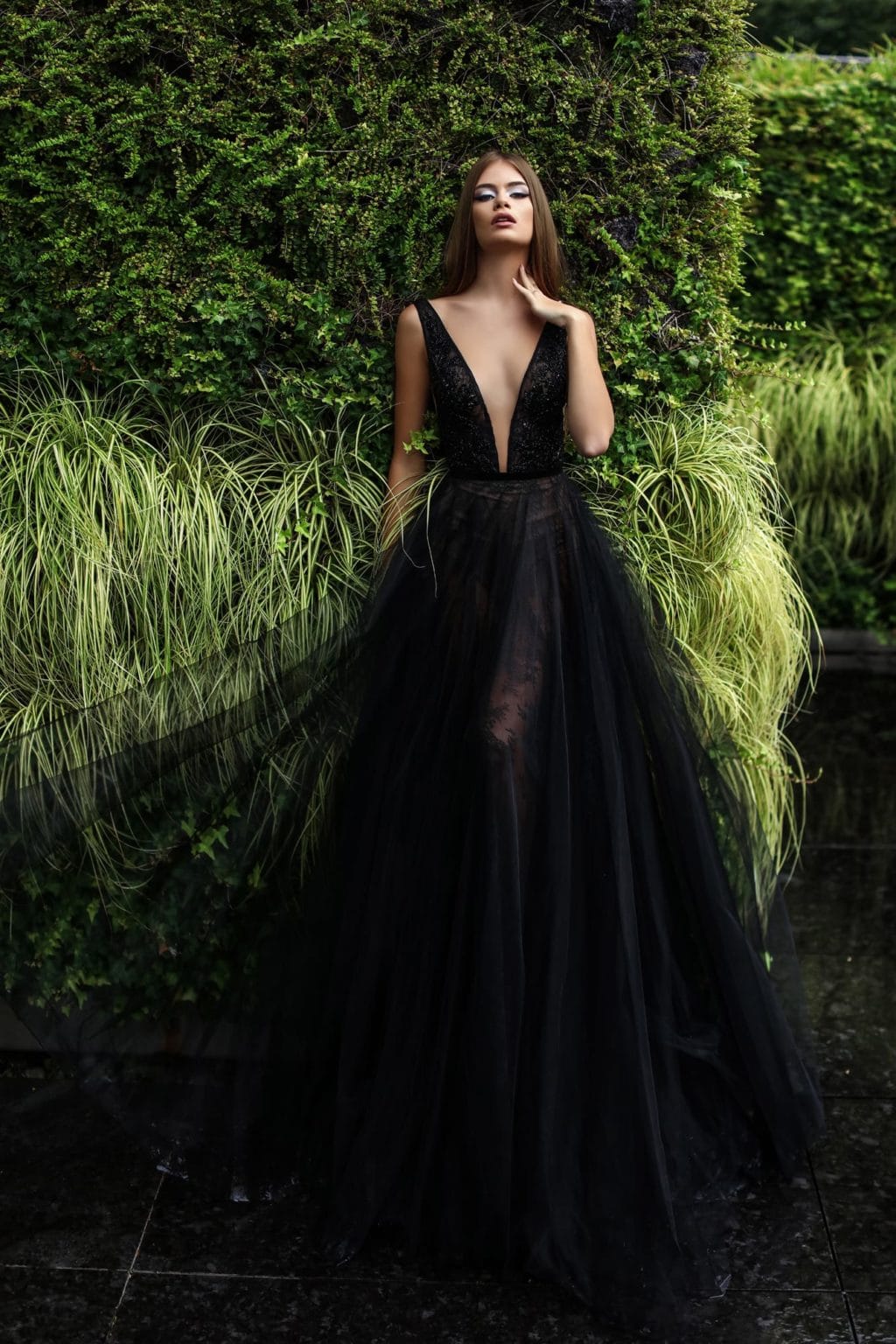 An extravagant black dress with a frank neckline will not leave anyone indifferent.