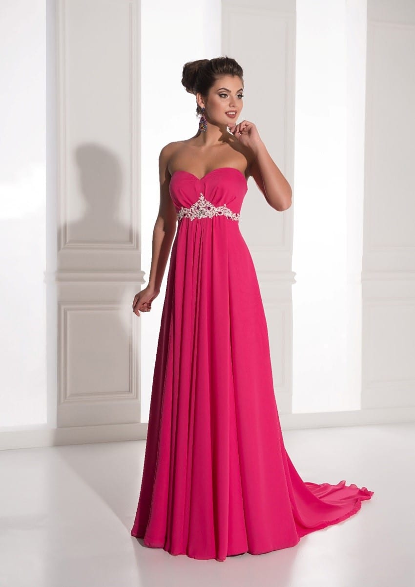 Superb, satin dress in rich pink color will suit any figure. The hairstyle can be made high or braided with unusual braids. For such a dress, it is better to choose silver or cream accessories to slightly dilute the image.