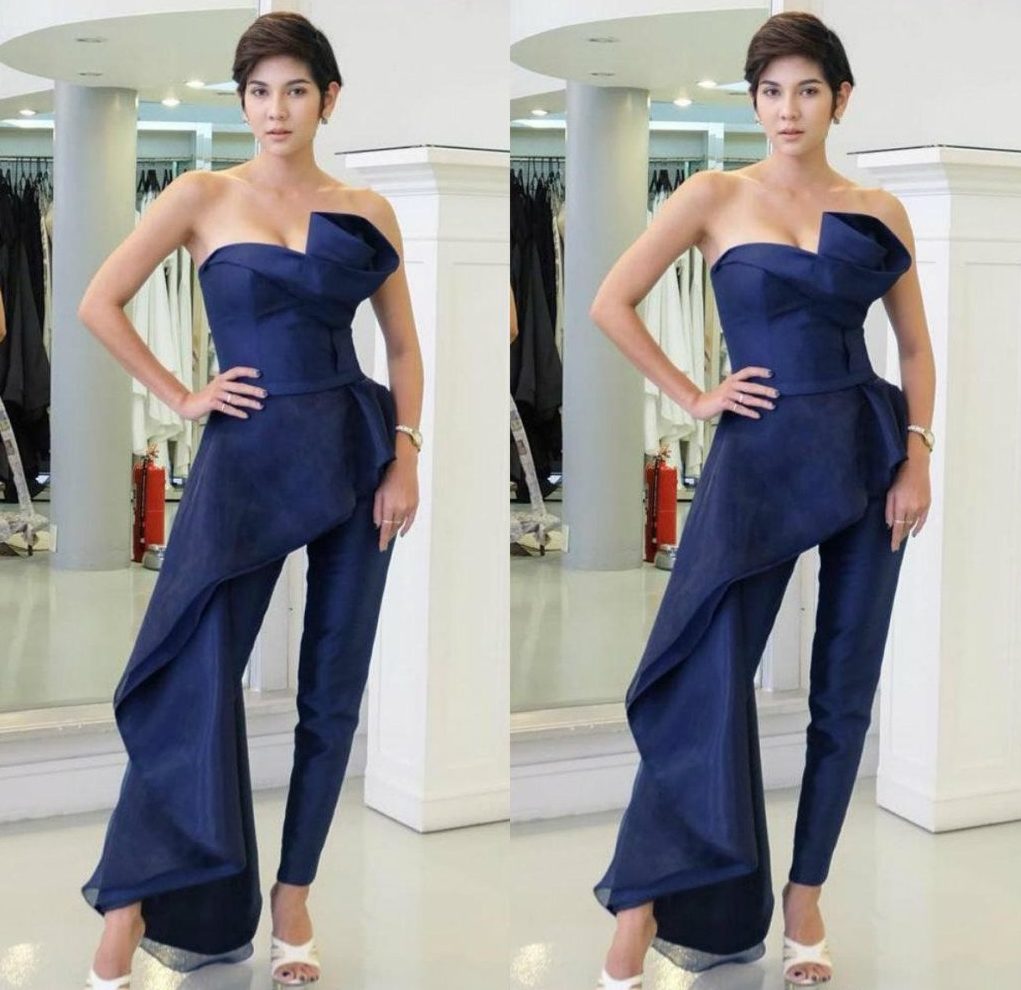 The original trouser suit with drapery is suitable for daring personalities. Silver watches and rings will complement this costume. White sandals will shade the blue color well.