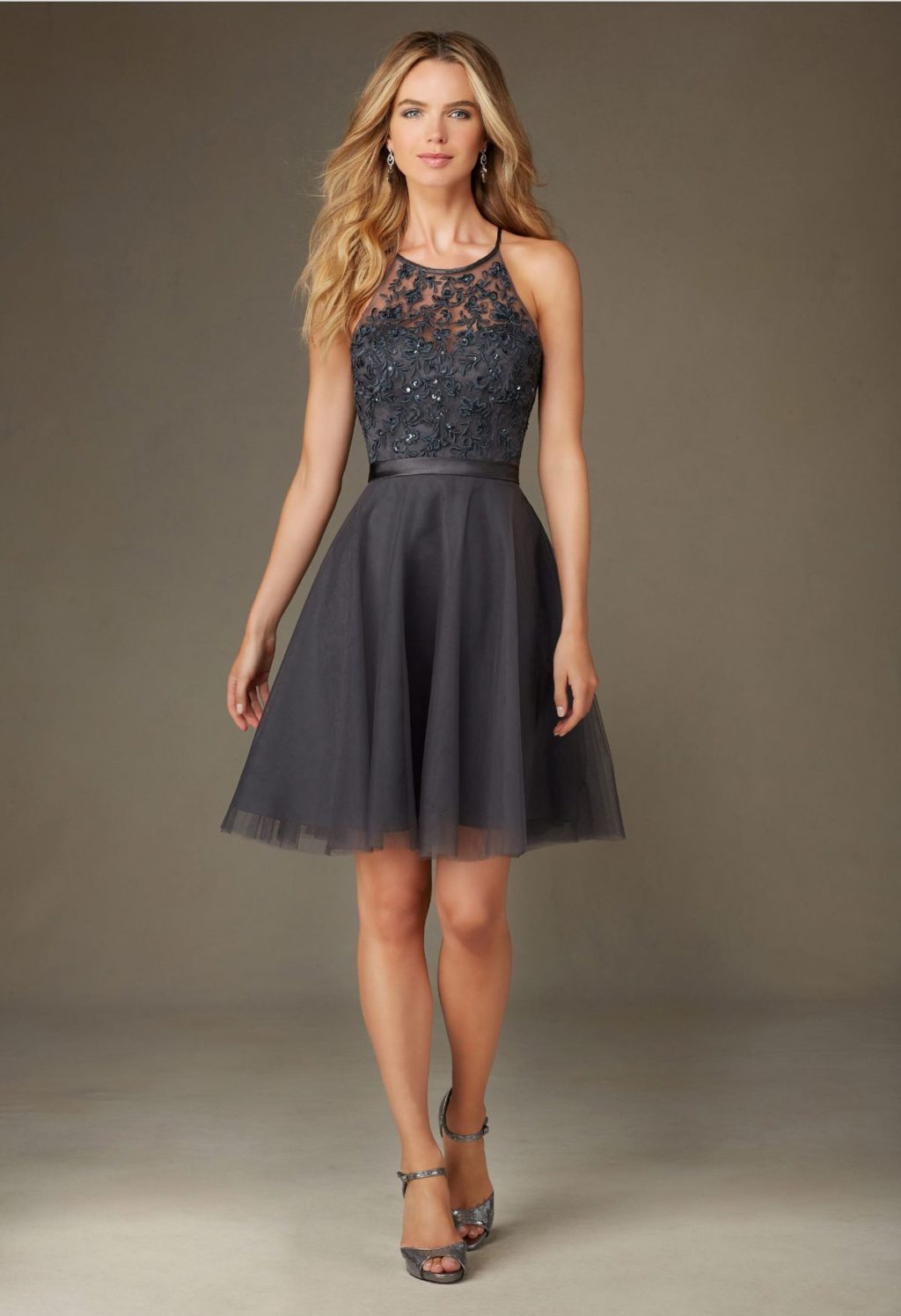 A graphite dress with sparkling stones will make you the queen of the dance floor on prom night. Make a bright make-up, and a manicure is best done in a nude style. So you do not oversaturate the image.