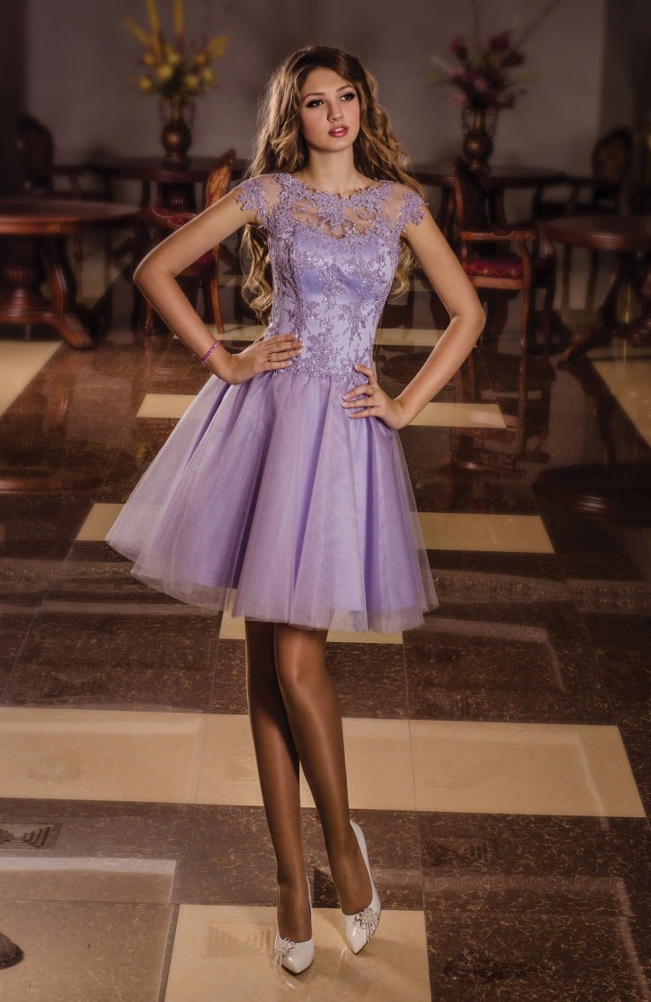 As accessories, you can wear a discreet bracelet and earrings in silver. Brown tights will complement the lilac dress, and white pumps will complement the look.