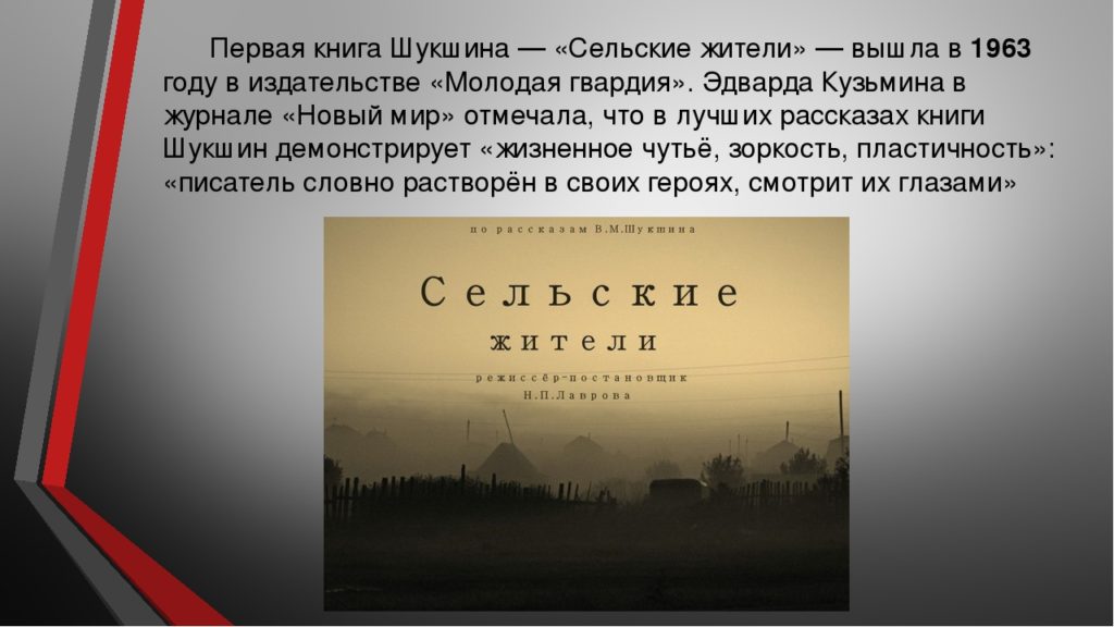 Vasily Shukshin did not stop writing stories, and so in 1963, two stories were published in the New World magazine: Class Driver and Grinka Malyugin. In the same year, his first book, Rural People, was published.