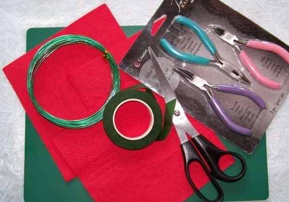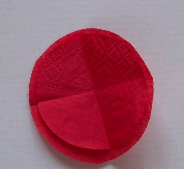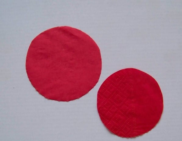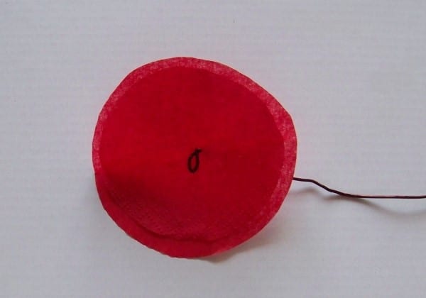 - From a red napkin you need to cut two circles: one less, the other more. Then you need to put a small circle on a large one and pass a wire in the center of them. To prevent the wire from popping out of the hole, you need to make a small loop, as indicated in the photo.
