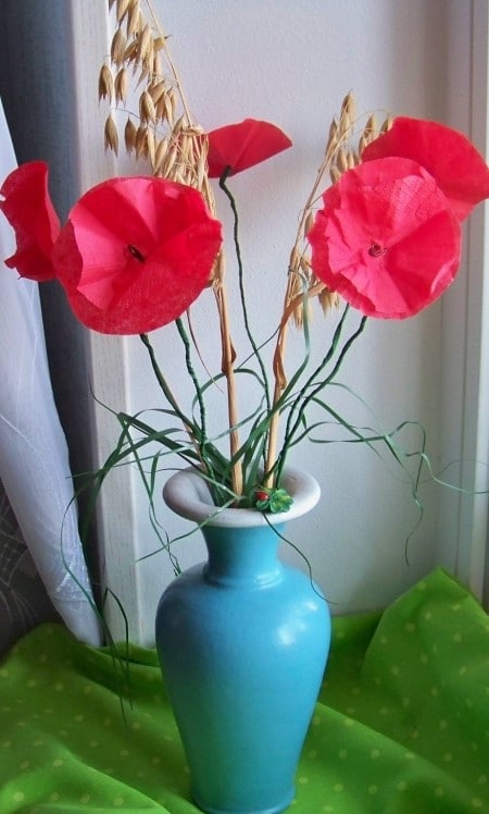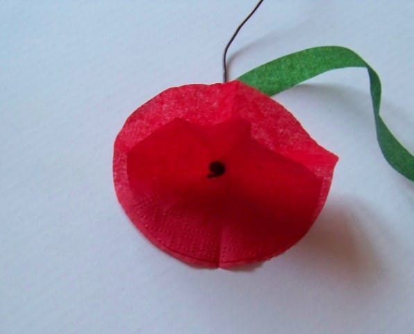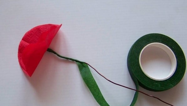 - And we wrap the rest of the wire, which is now the stalk of the poppy, with green tape or tape. Poppy petals should be raised up to give them volume.