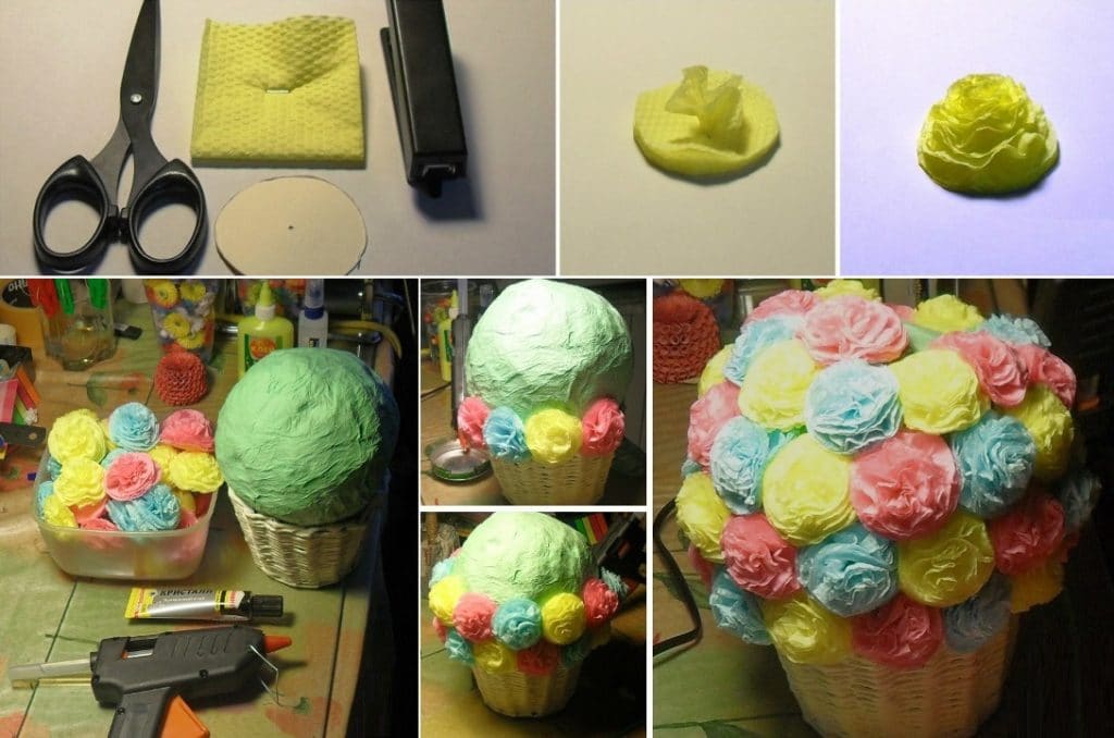 - You can make the buds yourself from napkins of different colors to make your future bouquet look brighter. The foam ball should be put in a flower pot, and begin to glue the ball at the base. Gradually move upward, trying as tightly as possible to fill the ball with buds of daisies.
