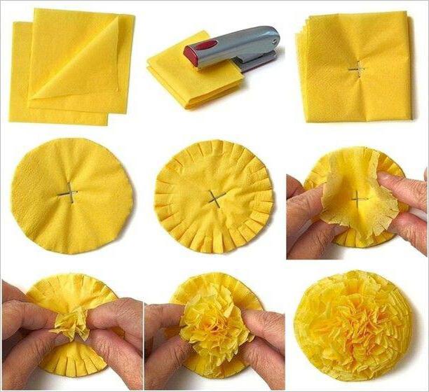 - To make a dandelion you will need yellow napkins. Take a few napkins and cut them into small squares. After the squares you need to chop in the center with a stapler and make a circle out of them.