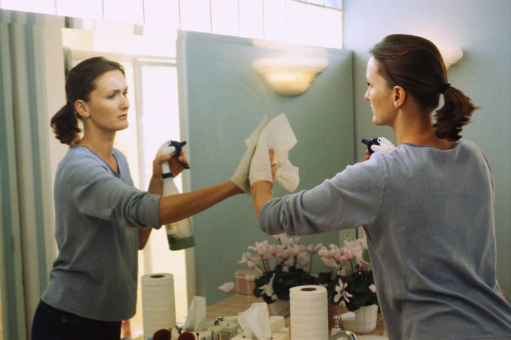 Apply window cleaner (any) to the mirror and then wipe it with microfiber. To prevent smudges, rub the mirror with newspapers or toilet paper. Then go to the faucet, where with a cleaning agent immediately wash it.