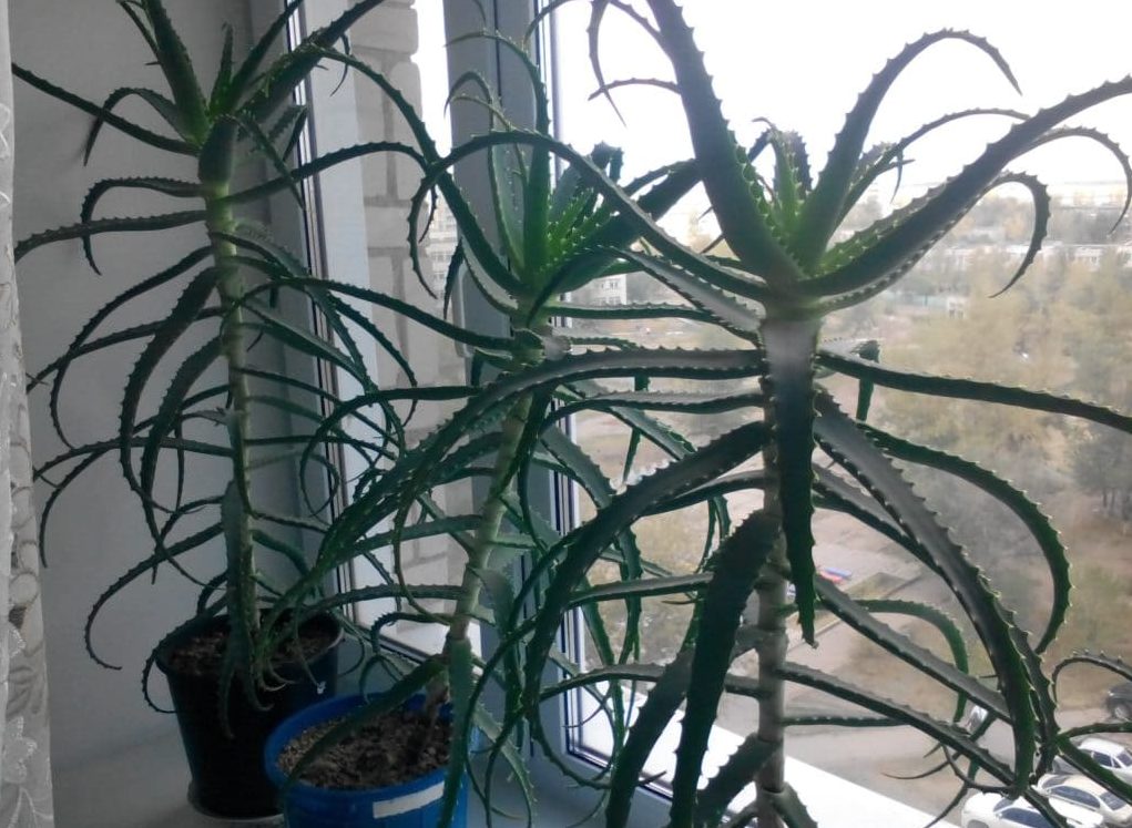 Aloe is a very unpretentious plant that does not require constant watering. An ideal option would be to water it 2 times a week, less often and only with standing water. It does not require transplantation, as well as top dressing. It tolerates both cold and heat.