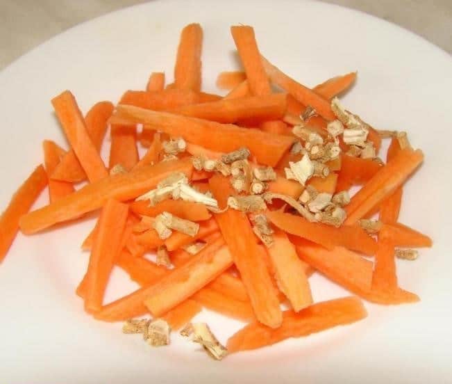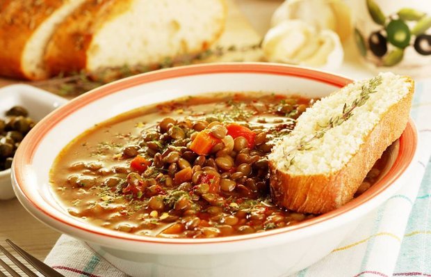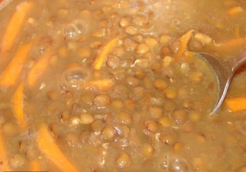 Then, add carrots and parsley into strips of lentils. Then cover the pan with a lid, but so that the steam can escape from it. When the lentils are almost ready after 30 minutes of cooking, chopped onions, bay leaves and spices to taste should be added to it. Cook for another 15 minutes and the dish is ready.