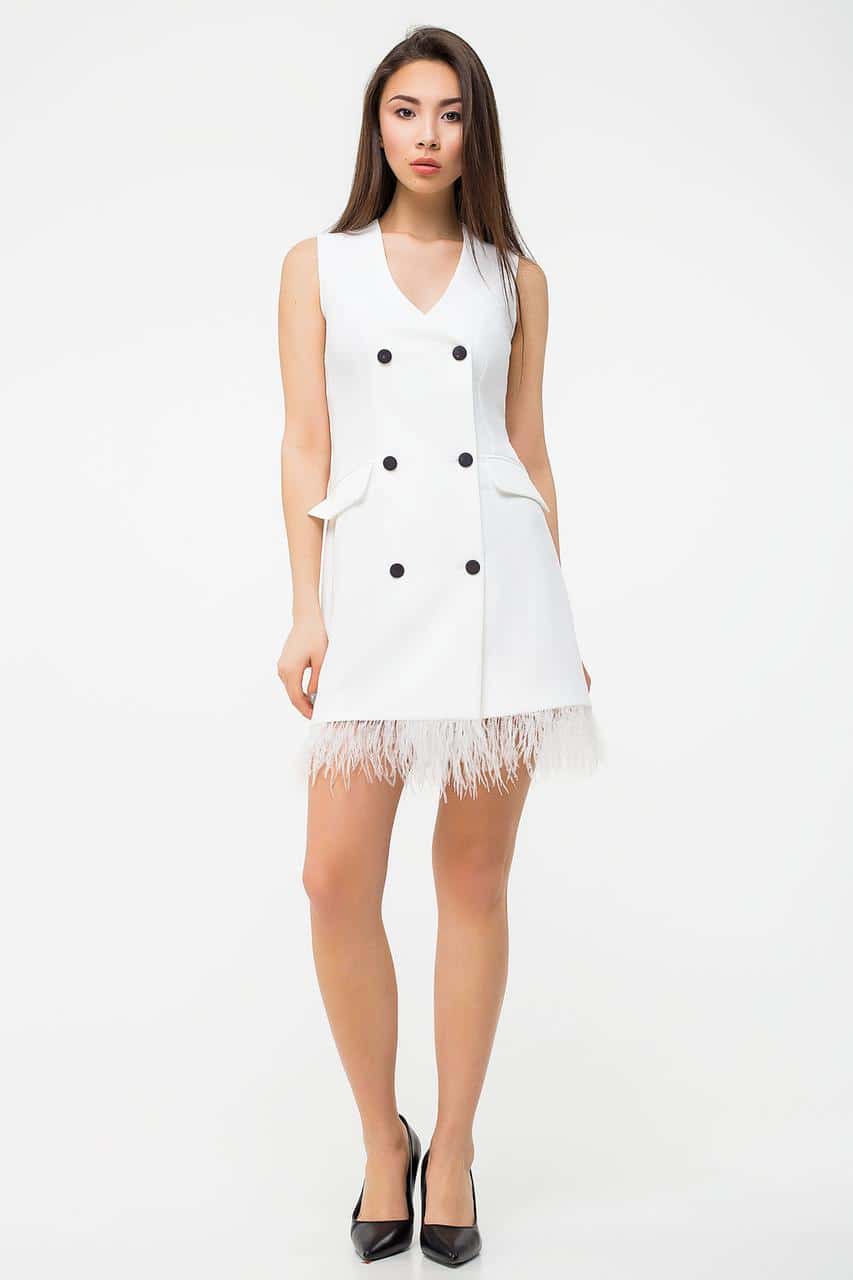 To create a business image, pay attention to direct and fitted models, restrained shades. Light models look good with clothes of a similar tone. Thus, we see that a white straight-cut jacket looks great with a pink dress. Beige sandals and a white bag are a good complement.