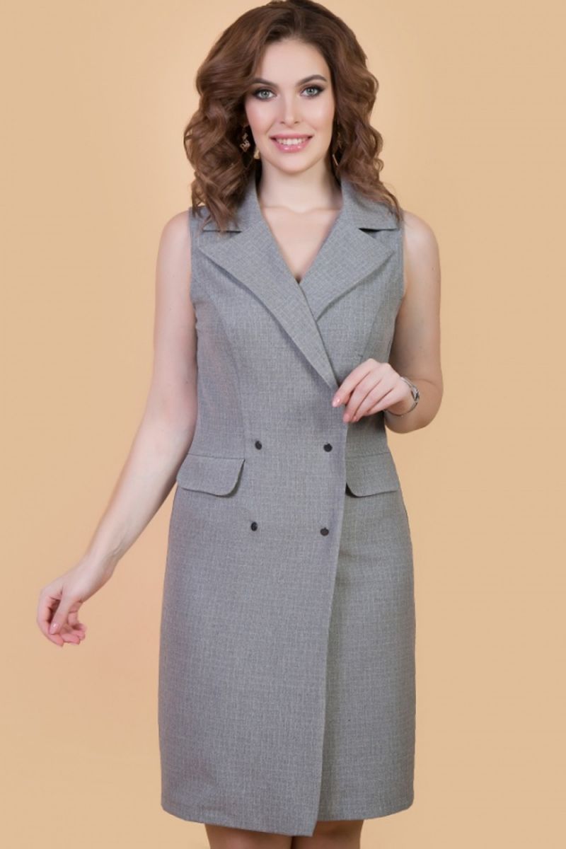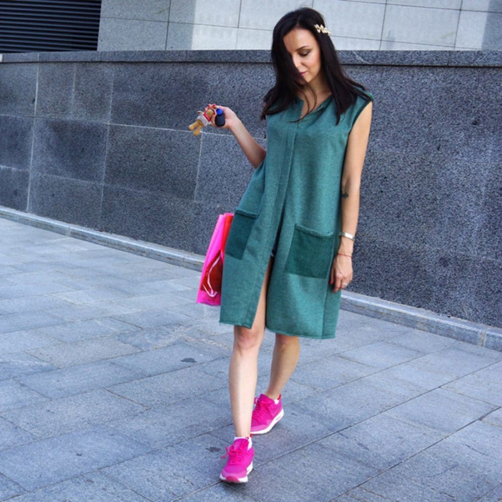 And wearing a blue dress and throwing a gray sleeveless jacket over it, we will bring femininity and originality to the image.