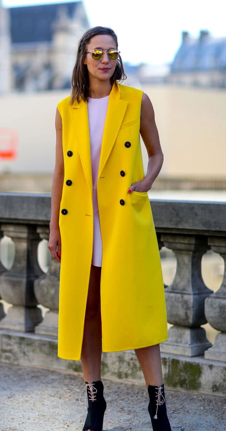 Bright shades harmoniously look at the contrast of a monophonic outfit. For example, a yellow elongated jacket is perfectly combined with a white dress and black batilons. Such an image will be feminine and romantic.