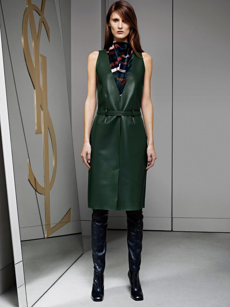 Selecting a dark green leather long jacket model, and dressing it as an individual outfit, complementing with leather over the knee boots and a bright scarf. We get a daring and extravagant image.