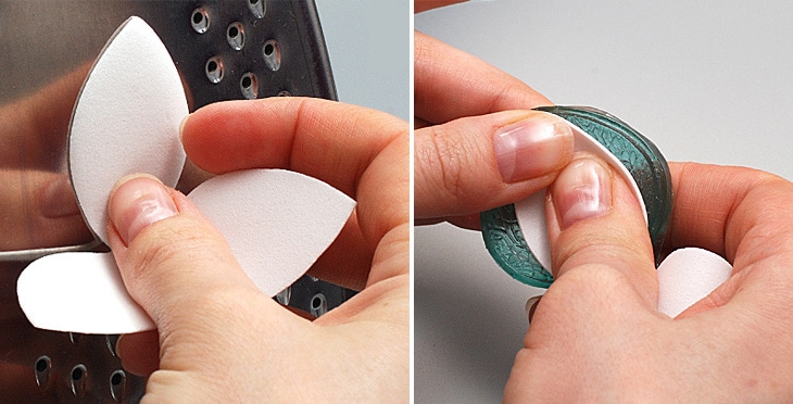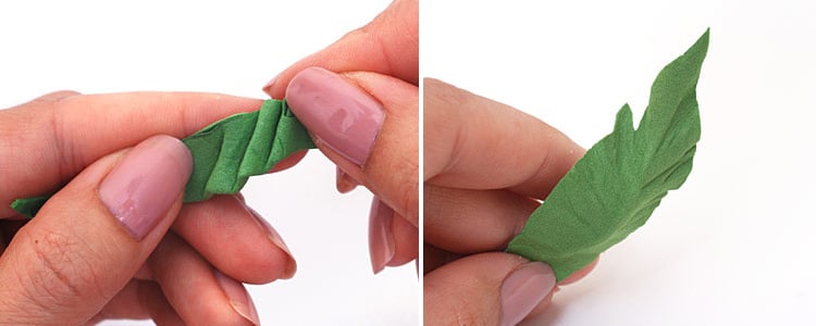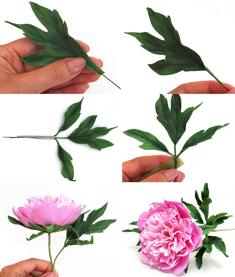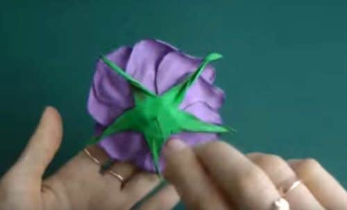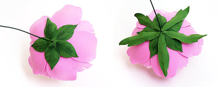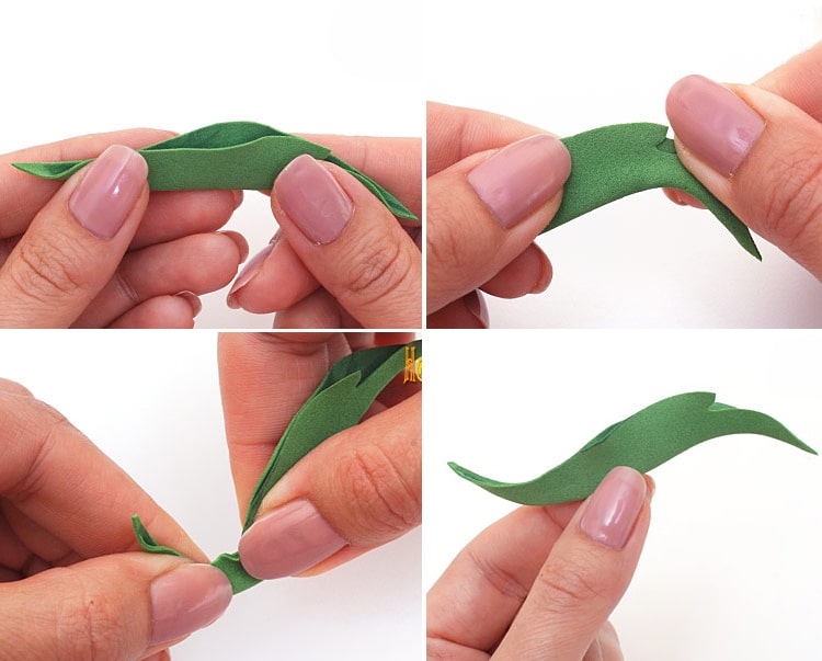 Heat the leaves on the iron in the same way to form twisted leaves out of them. String it on a wire and attach it to the base of the flower. Continue gluing the petals onto the rose, alternating the petals and gluing them in a checkerboard pattern.