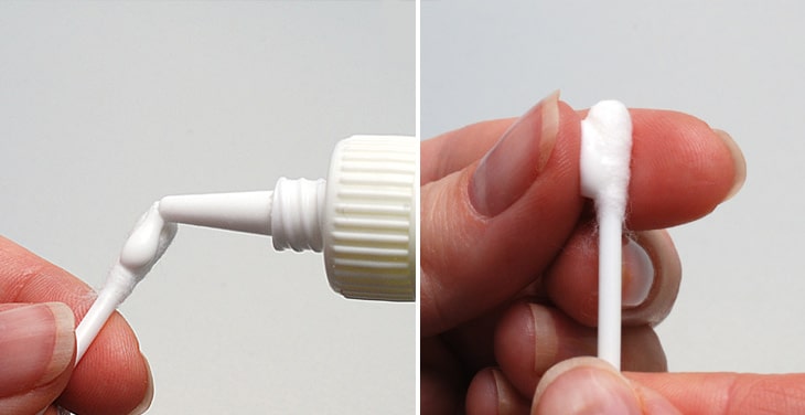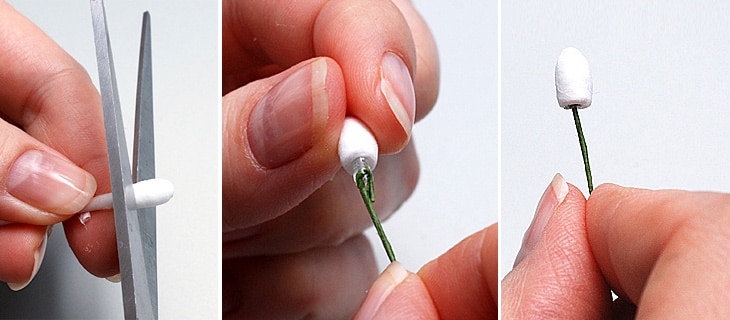 Now we take a cotton swab and put glue on it. Then we cut off the head with cotton and go to the wire. The tip of the wire needs to be bent a little to get a small hook. Lubricate it with glue and thread it into a cotton head.