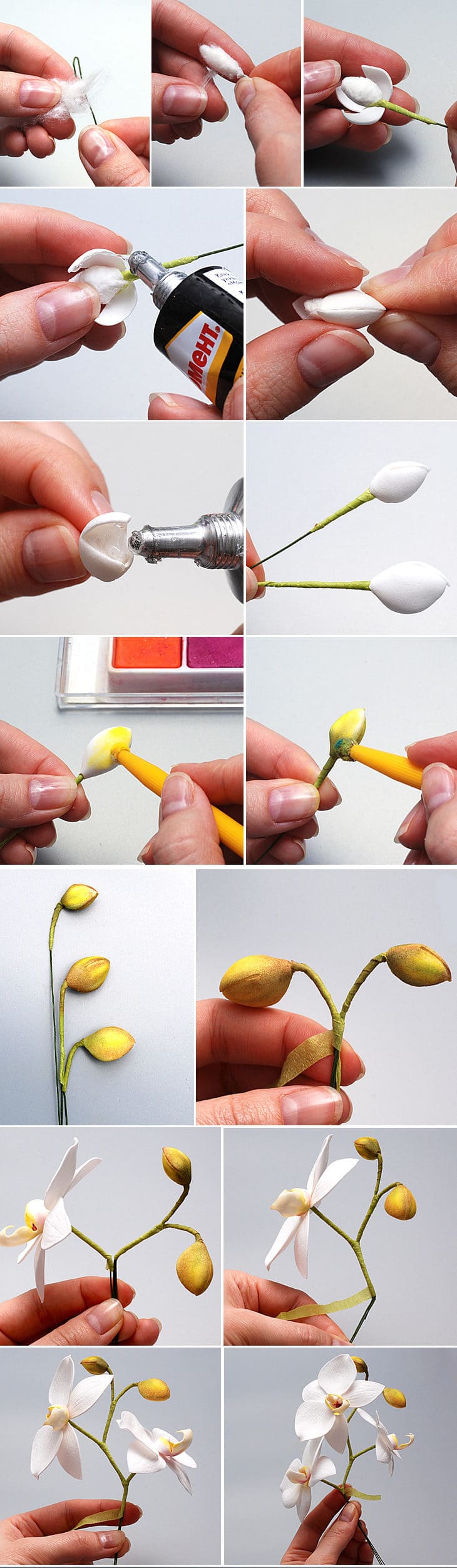 Next, you need to glue the lip to it, and then the side petals and sepals. Look at the photo hint to make it easier for you to collect your flower. When the bud is formed, then all subsequent cotton heads must be painted in gold color.