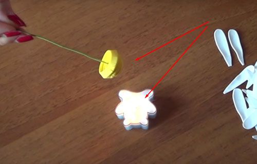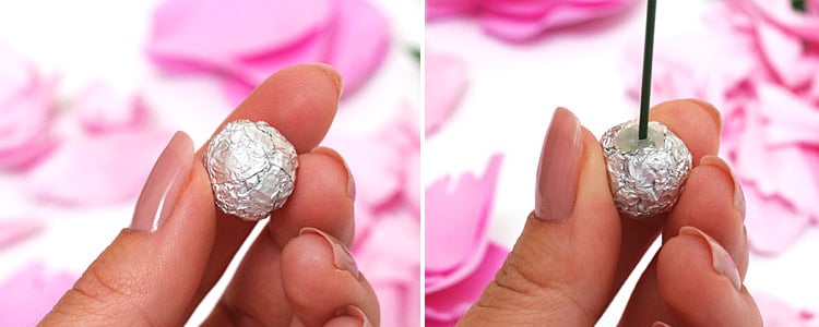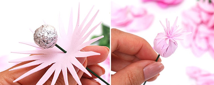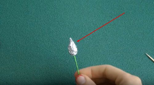 Wrap the wire with green type tape and form the core of the flower from the foil, which you need to fix with the glue gun. Then proceed to sticking our petals on the foil.