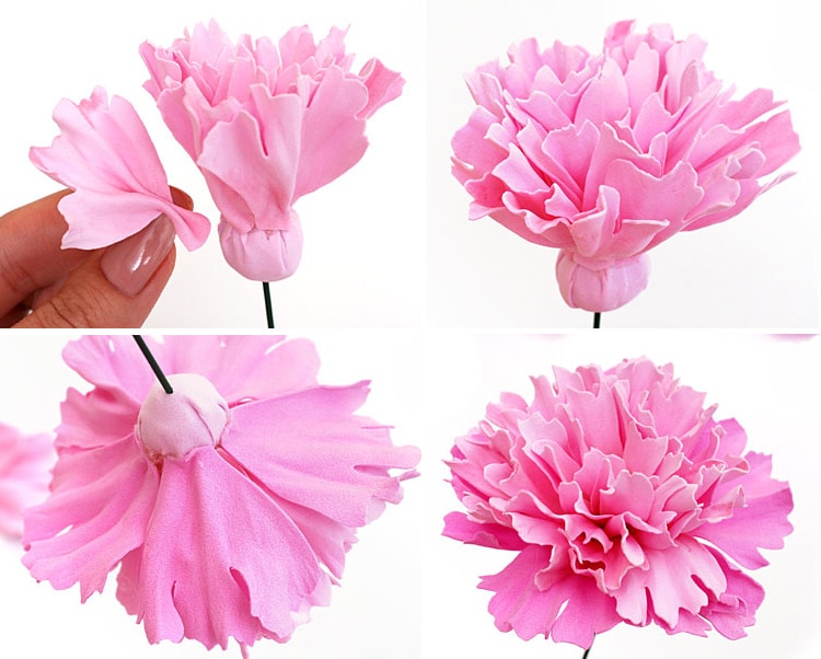 Now start sticking the petals to our core with a glue gun. When the first row of petals is formed, the second should be glued a little lower, positioning so that they are between the upper petals.