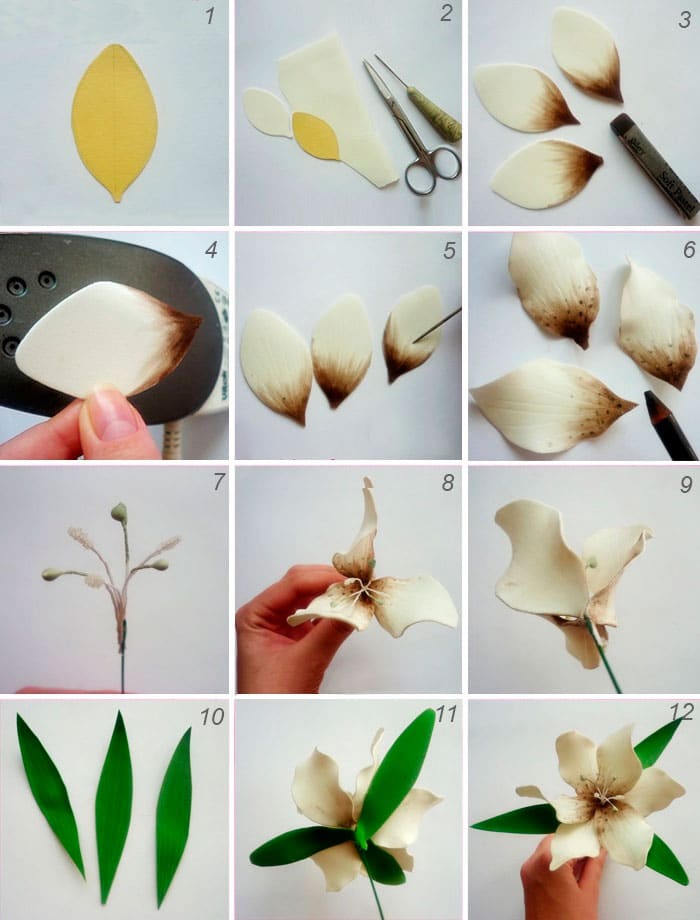 - Then our stamens must be glued to the wire and cut out three long green leaves from foamiran. To give texture to leaflets, you can also heat them on the iron. Now it’s worth moving on to flower formation. First, glue three petals around the stamens, and glue the others in a checkerboard pattern. The last touch will be to stick green leaves on the lily flower.