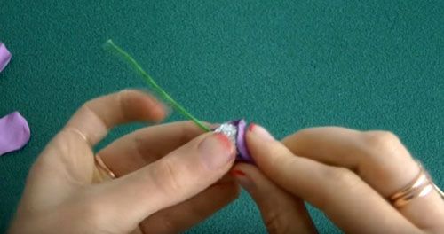 Then heat the petals on the iron and give them texture. Then you need to bend the tip of the wire so that you get a small hook. It is on it that you need to string fringe, thereby forming the middle of the flower.