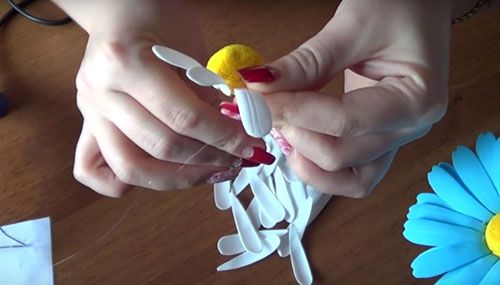 Chamomile will require a lot of time from you, as the flower has many small details. You need to cut 30 petals of oblong shape from white foamiran.