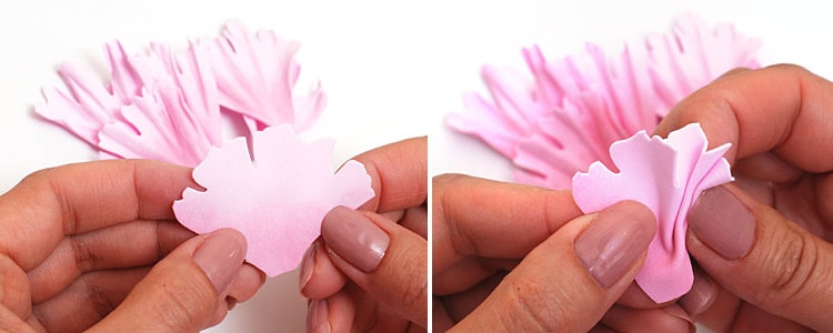 And petals C, we also do as a group of petals B. Now we turn to our leaves. They need to be folded in half and stretched. Crumple the foamiran on the sides with folds to create a leaf frill effect.