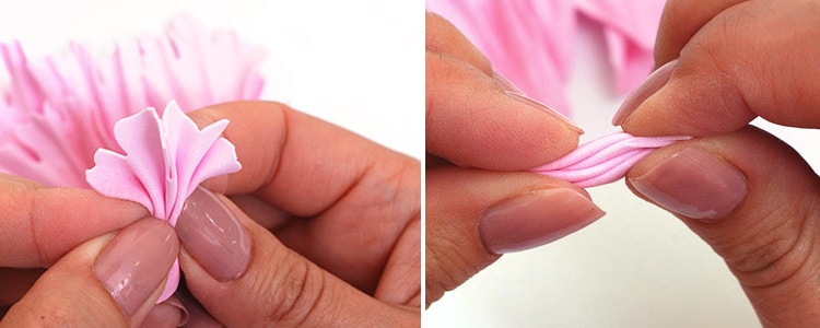 We turn off the sharp rays of the workpiece and with the help of yellow paint we make stamens. Next, using a glue gun, you need to glue ten petals of group A to the core. After that comes the turn of group B - alternating dark pink and light pink.