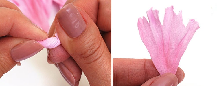 We heat our petals on the iron and form our flowers. You should end up with such details. To make the veins, you need to draw the veins or make an imprint of them with a crochet or blunt part of the tweezers while the material is warm.
