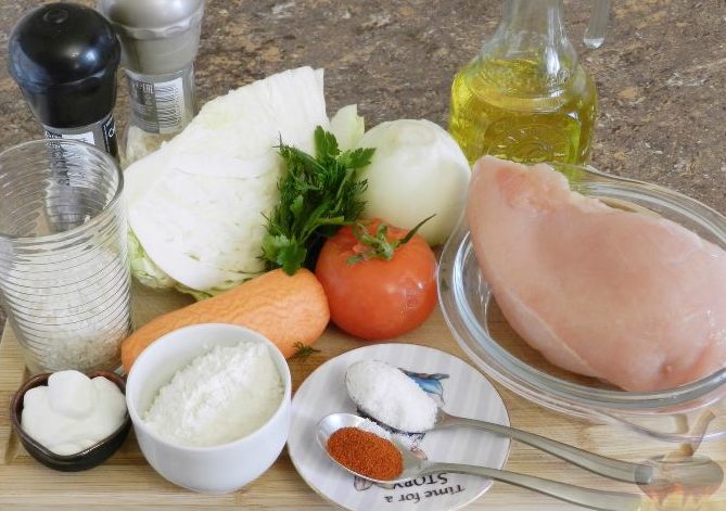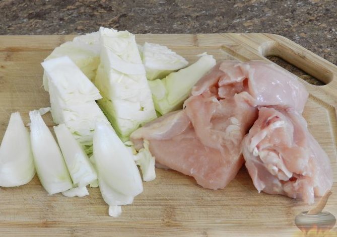 Chicken fillet, cabbage and onions, cut into small pieces so that it is more convenient to twist the products through a meat grinder.