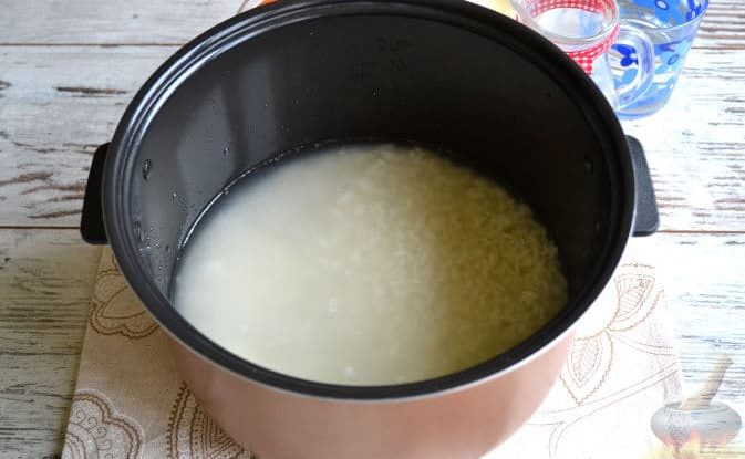 The mode on the slow cooker should be “Cooking”. We rinse the rice and put it in a slow cooker and cook for 15 minutes. Then half-cooked rice should be washed with cold water.
