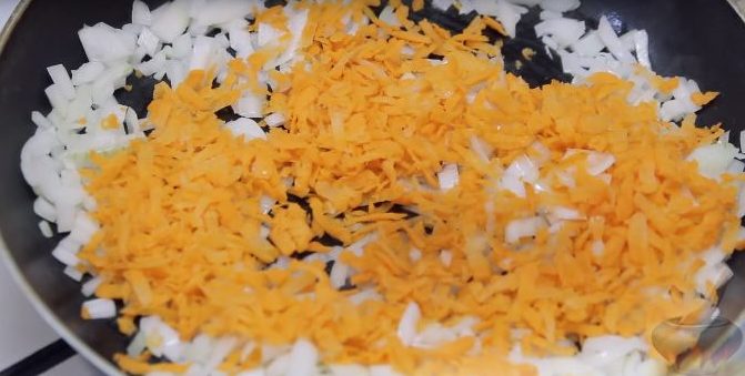 We heat vegetable oil in a pan and fry onions, carrots with salt and spices on it.