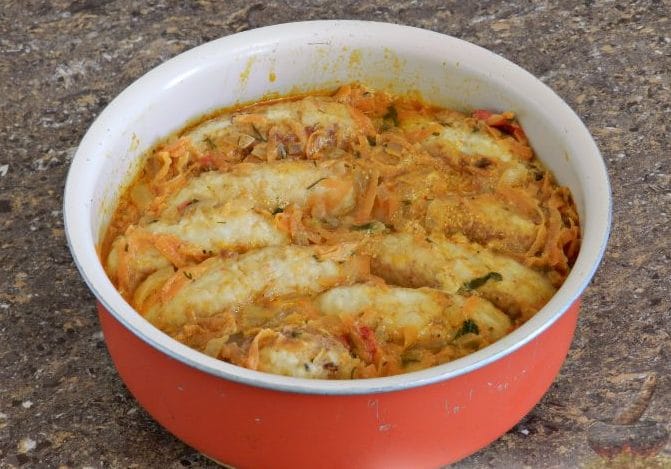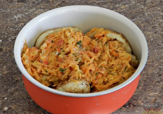 Now you need a stewpan. Put cabbage rolls in it, pour water on the eye, put all the vegetables on top and cover them with a lid. Stew lazy cabbage rolls over low heat for 30 minutes.