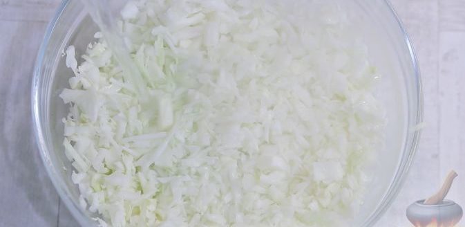 Finely, finely chop the cabbage, and in a pan we heat the vegetable oil, with the addition of salt and spices. Stew the cabbage in a pan for 10 minutes, and then leave it to cool completely.