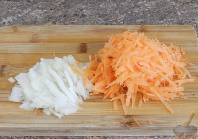 For the sauce you need to finely chop the onion, and grate the carrots on a coarse grater. Tomatoes should be peeled and cut into small cubes.