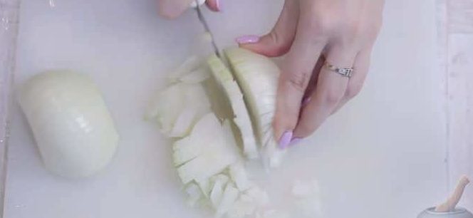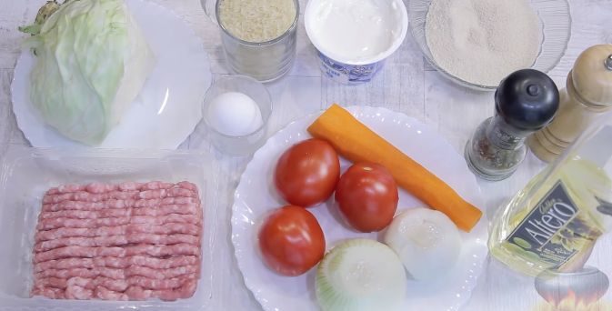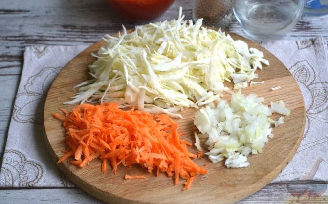 We wash all our vegetables, peel carrots and onions. Rice also needs to be washed and boiled until cooked. Finely chop the cabbage and pour boiling water for ten minutes in any container.