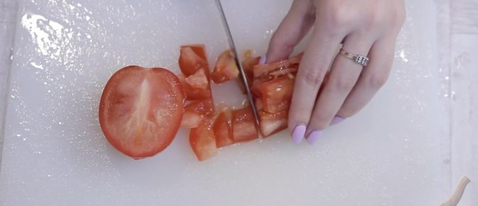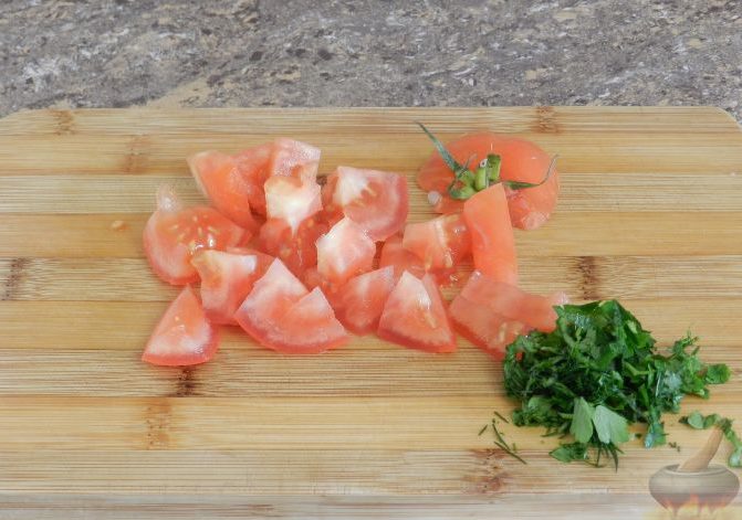 The tomato should be peeled and cut into small cubes. Finely chop the herbs and parsley.