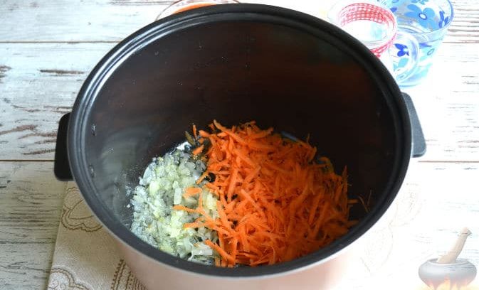 Now you need to chop the cabbage, finely chop the onion and grate the carrots. Set the option "Frying" and fry the onions and carrots for 5 minutes. When the vegetables are fried, add the minced meat to them and fry for another 2 minutes.