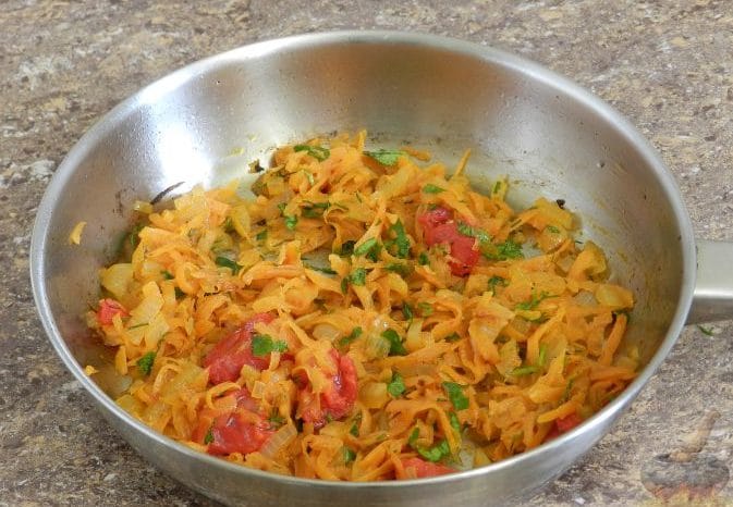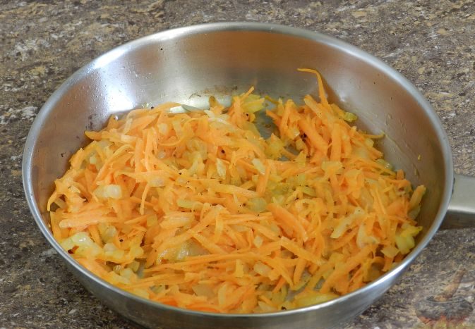 First you need to fry the onions in a pan, and then add the carrots to it. When the vegetables are almost ready, add the tomatoes to them and simmer for several minutes.
