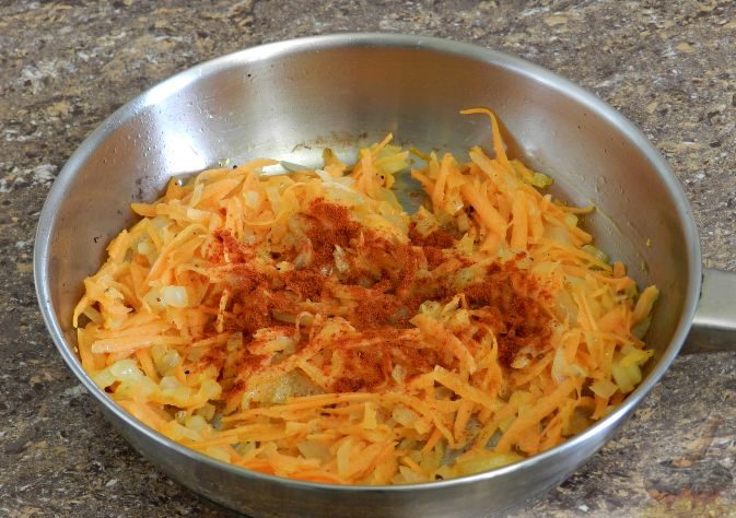 Fry onions and carrots in butter preheated in a pan, and add spices and garlic to them a little later.