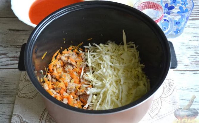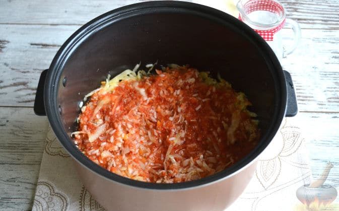 Then you need to dilute the tomato paste, add it to the crockery, and pour the cabbage on top. After it is worth pouring rice into it, mix everything and simmer on the “Stewing” option for 30-40 minutes.