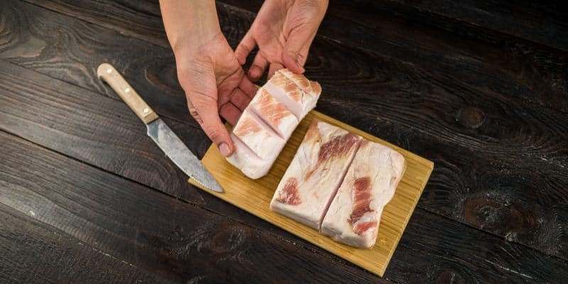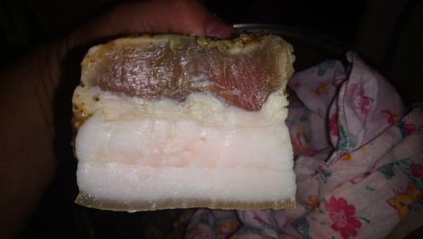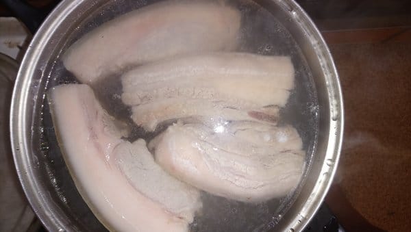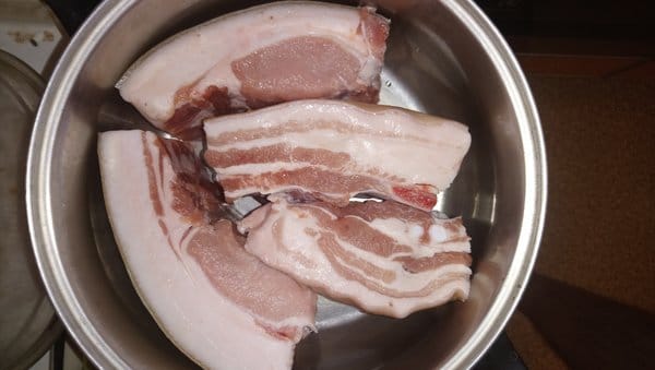 Take a deep pan to fit our lard there and have enough space for water, which should cover the lard completely. The fat should be washed well, clean the crust of bristles and dark spots, and then cut into large pieces.