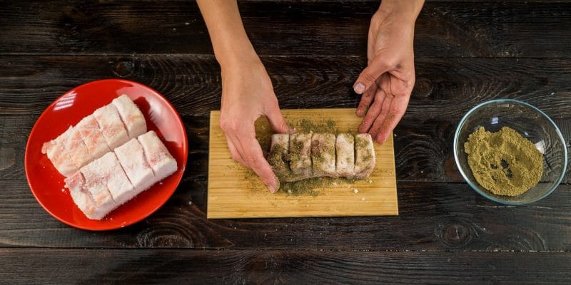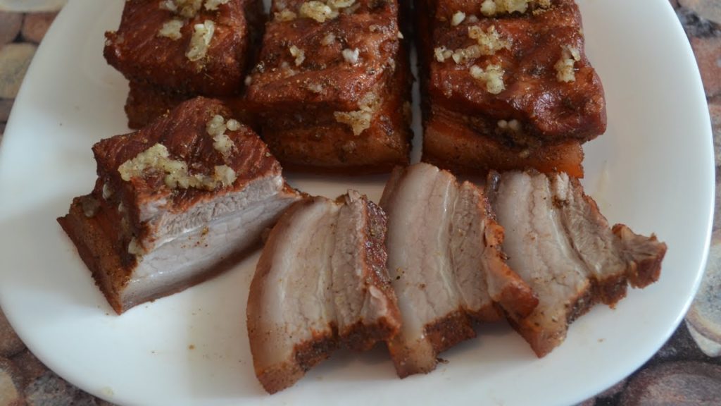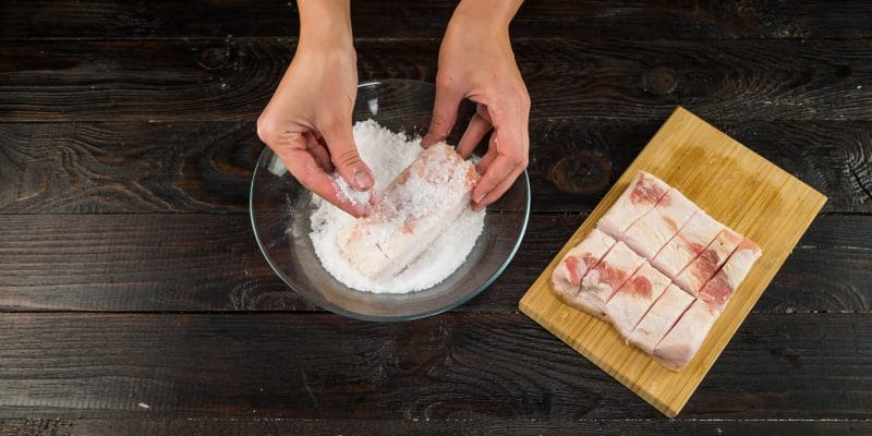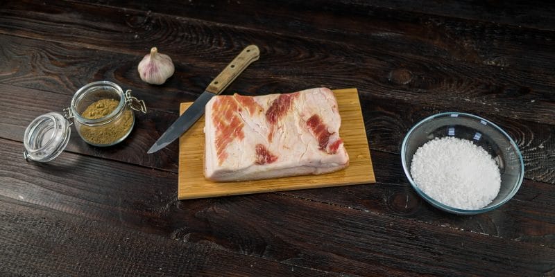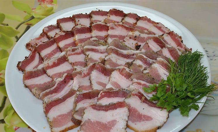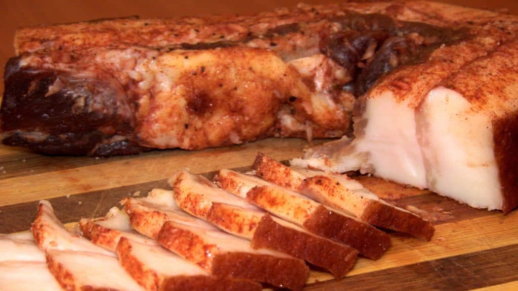 Lard should be cut into small pieces, and then put them in a solution of water and salt. After the garlic, bay leaf and herbs, chopped into pieces, must be added to the solution. Mix well.