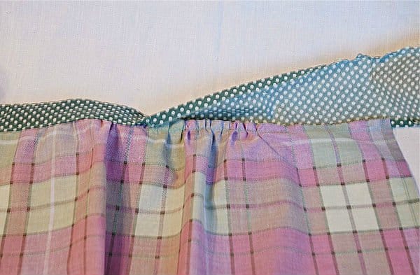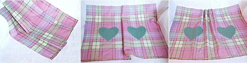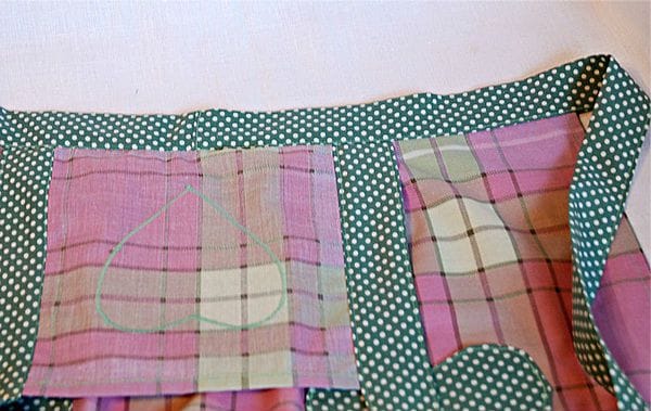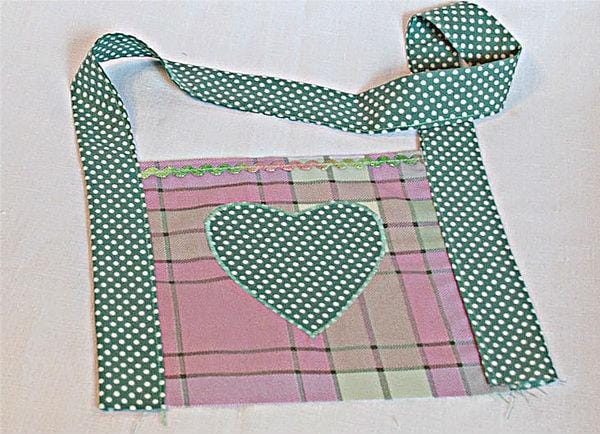 - After you have made small folds on the apron, it's time to connect your top and bottom of the future apron. In the center of the chest part and the apron part, you need to lay the wrong side of the top, placing it symmetrically and fix the part on the sides of the center. We also fix our tie down face down.