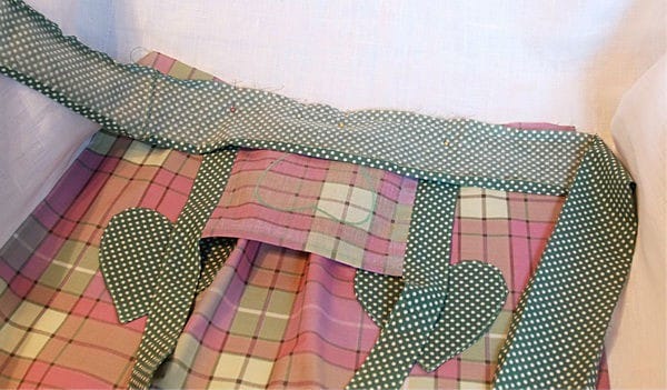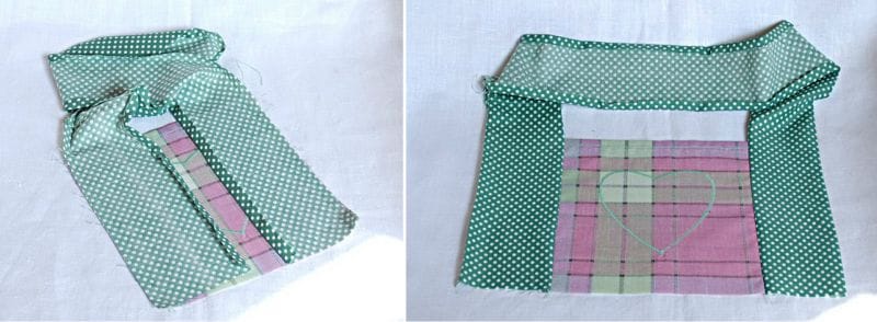 - Now go to the ties and belt. We attach the rectangles from the inside out, not forgetting to retreat from the edge and afterwards we twist and iron. To correctly stitch the ties, you need to attach the front part to the inside of the chest part and make a stitch. After the seam you need to iron.