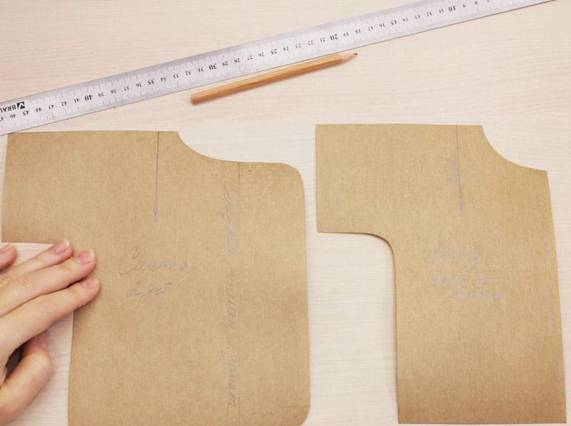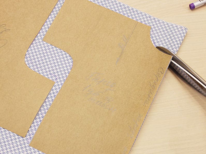 - We start work with the part of the shelf that you need to put on the fabric and adding 1 cm to the seams to cut it. Then we repeat the steps, only with the back detail, also remembering to leave one centimeter for the allowances, and two from the bottom.