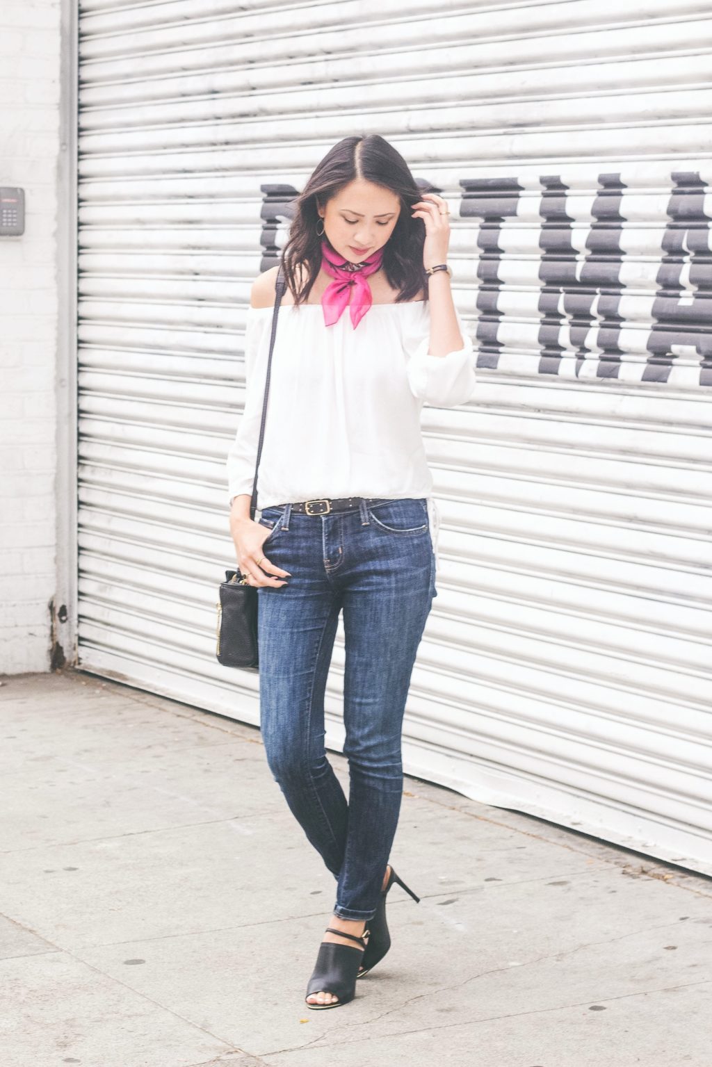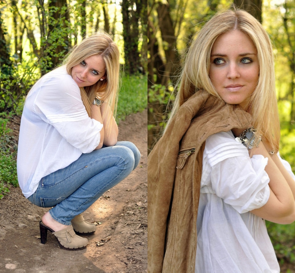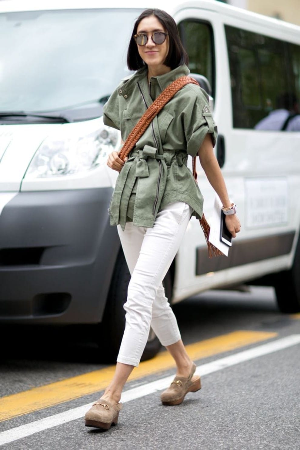 Beautiful contrast of colors will help to achieve a white top, which goes well with blue jeans. Black clogs in such a tandem will be especially distinguished.