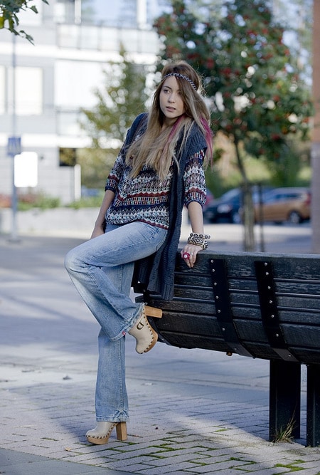 The most popular option is clogs and jeans. The most interesting thing is that any kind of jeans fits any kind of clog. These can be skinny skinny models, wide jeans, bananas, as well as youth boyfriends. Flared jeans will become a particularly relevant choice.